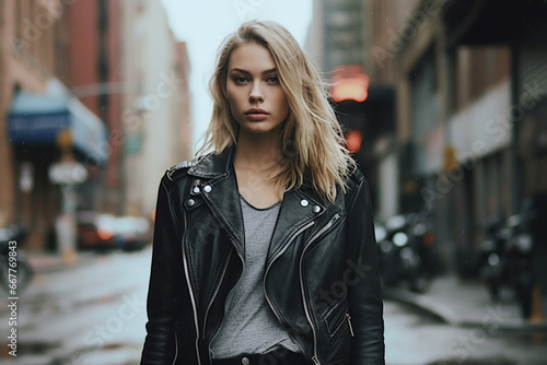 Fototapeta premium Stylish woman in elegance black jacket at city street