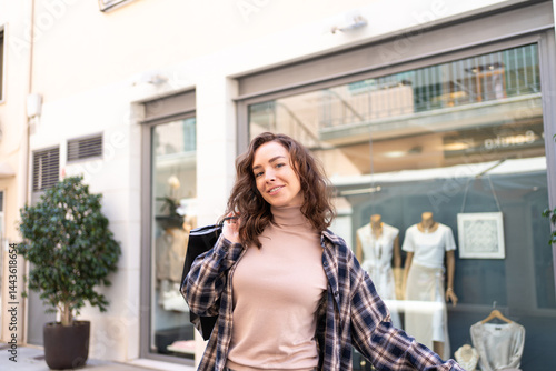 © vfhnb12, Fototapeta premium Stylish woman with shopping bags walking outside a fashion boutique, enjoying a shopping day in the city.