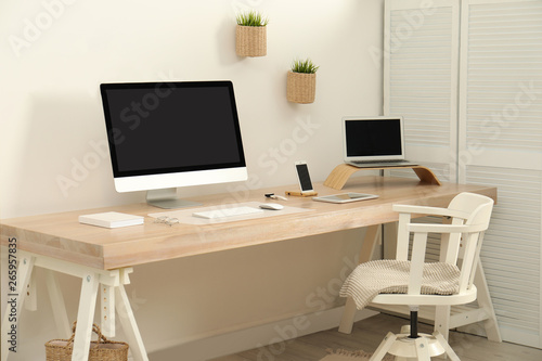 Fototapeta premium Stylish workplace interior with modern computer on table. Mockup for design