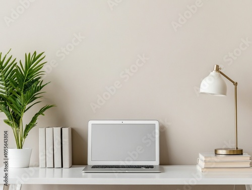 Obraz premium Stylish workspace featuring a laptop, lamp, books, and a plant, perfect for...