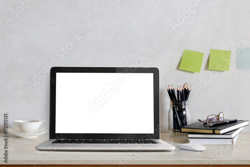 © bongkarn, Fototapeta premium Stylish workspace with laptop computer, office supplies houseplant at home or studio office. Mock up Desk space blank screen for graphic montage.