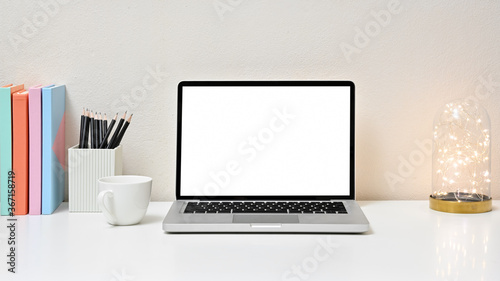 © Kittipong, Fototapeta premium Stylish workspace with laptop, lightbulb, coffee cup, office equipment and blank screen laptop on white table in home office. Front view. concept work from home.