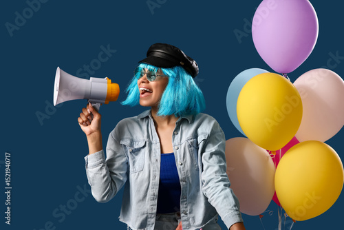 Naklejka premium Stylish young African-American woman in wig shouting into megaphone and balloons on blue background