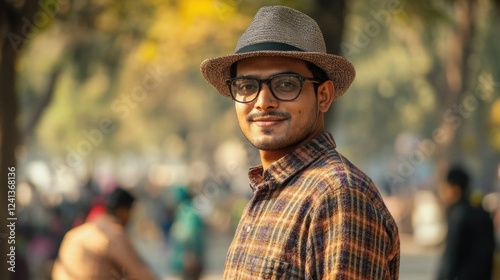 © The 2R Artificiality, Obraz premium Stylish young man with glasses and hat posing outdoors in vibrant Connaught Place, New Delhi during sunny day with soft bokeh background.