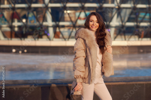 © Dmitry Tsvetkov, Fototapeta premium Stylish young woman wearing casual winter clothes and coat with fur hood standing or walking at city street on a sunny day. Fashionable girl