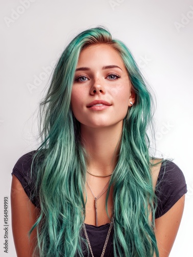 Fototapeta premium Stylish young woman with long teal hair. Perfect for fashion, beauty, and...