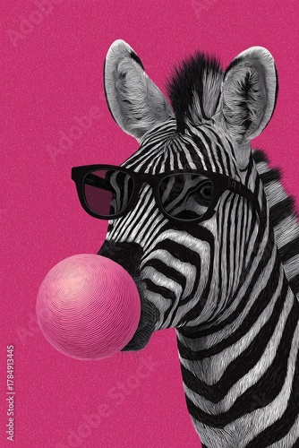 © ArtCookStudio, Obraz premium Stylish Zebra Blowing Bubble Gum on a Vibrant Pink Background in a Playful Artistic Setting