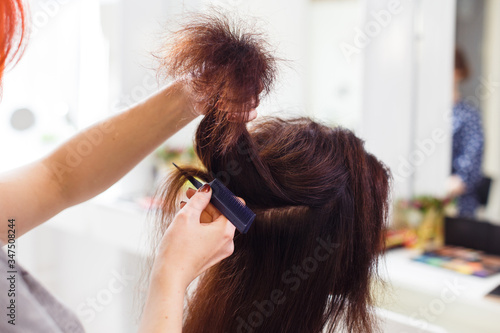 Naklejka premium Stylist align the customer's hair with straightener