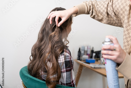 © Artsiom P, Fototapeta premium Stylist fixes curls with hairspray