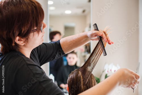 Fototapeta premium Stylist hairdresser doing haircut closeup of work equipment, the beauty industry