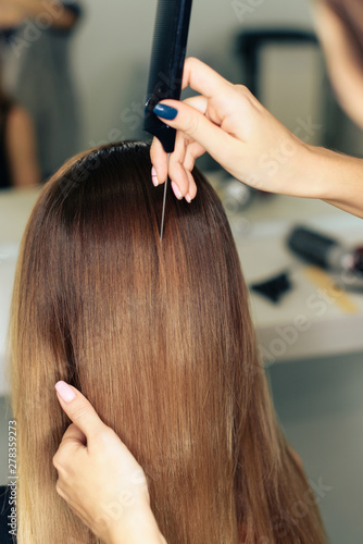 Naklejka premium stylist's work with the hair of a girl in a beauty salon