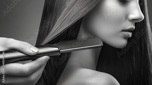Obraz premium Stylist using a flat iron on long, sleek hair, emphasizing the shine and...