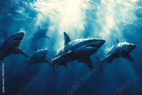 © Natalia, Fototapeta premium Stylized, abstract sharks with glowing accents in gray and blue,