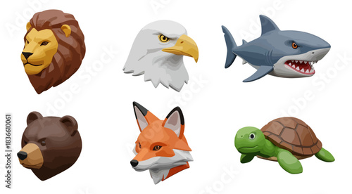 © ktp, Naklejka premium Stylized animal heads collection lion eagle shark bear fox turtle