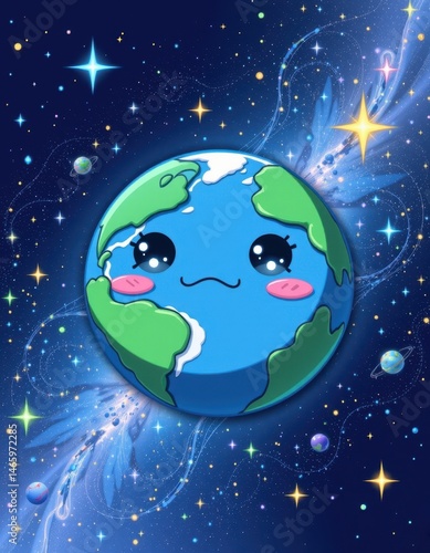 © Na, Fototapeta premium stylized anime inspired earth with expressive eyes and a small frown, placed in a starry, animated space scene