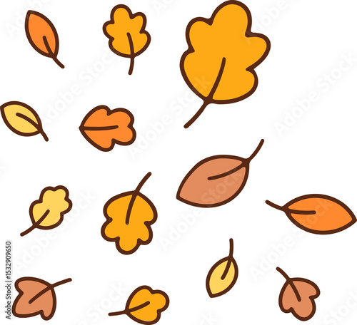 Fototapeta premium Stylized autumn leaves are falling in flat design with transparent background and warm hues