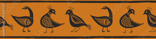 Obraz premium Stylized bird seamless vector border. Banner with mix of folk art or ancient history style birds and painterly stripe edging. Ochre black design for header, ribbon, museum exhibition, concept
