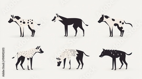 Fototapeta premium Stylized Black and White Animal Illustrations Featuring Various Dog-like...