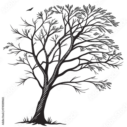 Naklejka premium Stylized black and white drawing of a bare tree with a bat flying