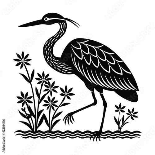 © Nayon Chandro Barmon, Fototapeta premium Stylized Black and White Heron Illustration with Tribal Pattern Design