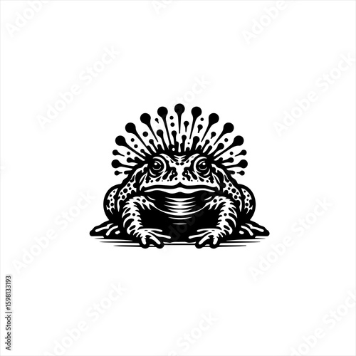 Obraz premium Stylized black and white illustration of a frog with a spiky crown