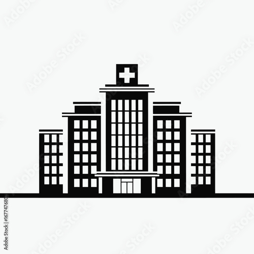 Fototapeta premium Stylized black and white illustration of a hospital building with a cross on top.