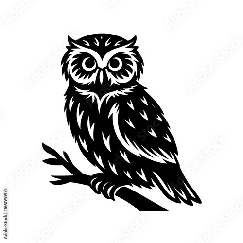 © MH Shipon, Fototapeta premium Stylized black and white owl perched on a branch vector illustration