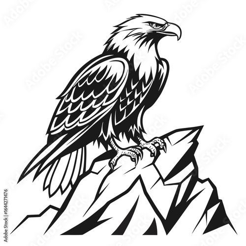 © Zia, Obraz premium Stylized black and white silhouette of a perched eagle on a rocky outcrop bird