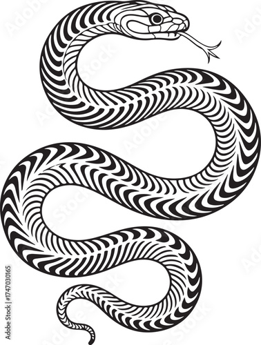 © Mahafuj, Fototapeta premium Stylized black and white snake with optical illusion pattern on white background serpent reptile