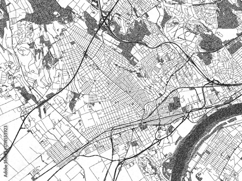 © W&S Stock, Naklejka premium Stylized black and white urban map of Erd, Hungary, hand-drawn for decor and creative use.