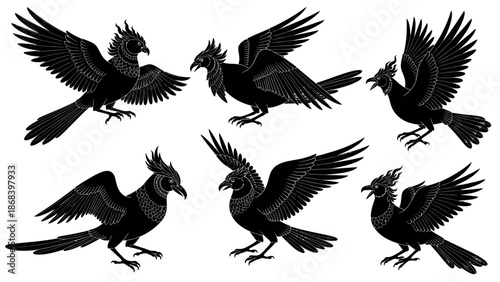 Obraz premium Stylized black bird illustrations in various poses on a white background