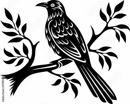 © bashanti, Fototapeta premium Stylized black bird perched on a branch with leaves
