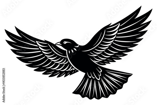 Fototapeta premium Stylized black bird with outstretched wings in flight captured against a white background, showcasing intricate feather details
