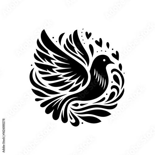 © SARMIN DESIGN, Obraz premium Stylized Black Dove with Hearts and Swirls.