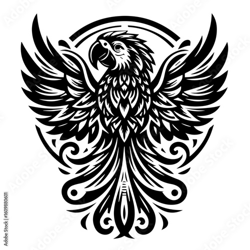 © ISMILE, Obraz premium Stylized Black Macaw Parrot Emblem.