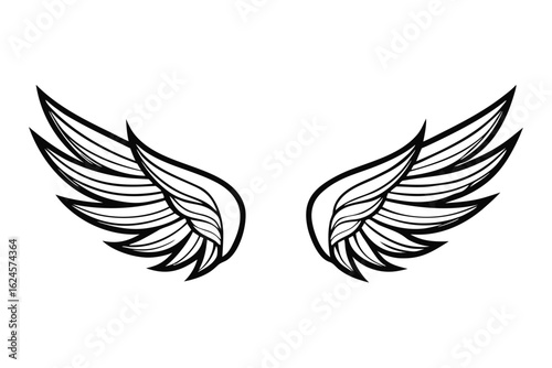Obraz premium Stylized black outline angel wings with detailed feathers on white background