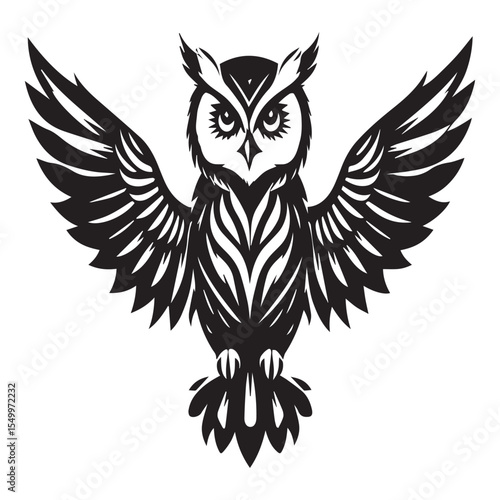 Obraz premium Stylized black owl with wings spread wide against white background