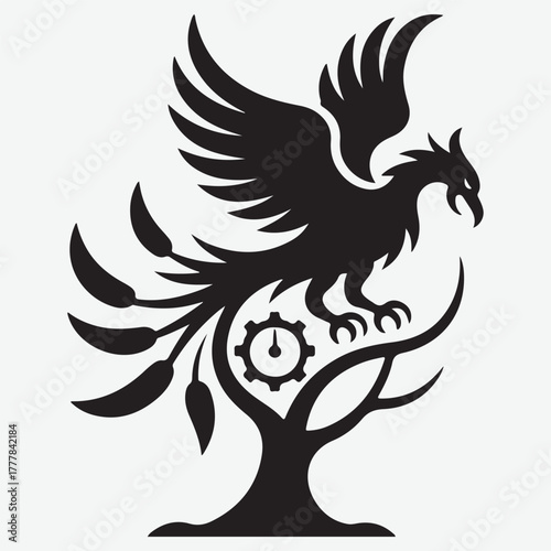 Obraz premium Stylized Black Phoenix Perched on a Tree with a Gear