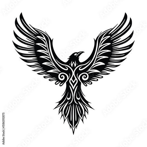 Obraz premium Stylized black phoenix with elaborate tribal wing design silhouette