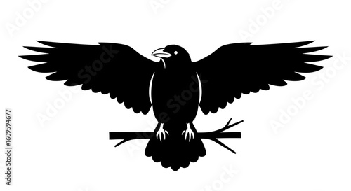 Obraz premium Stylized black raven silhouette perched on a branch with its wings spread wide.