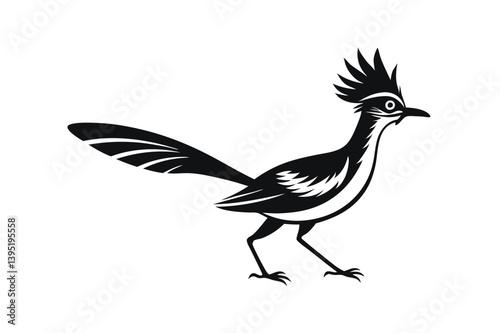 Fototapeta premium Stylized Black Roadrunner Bird with Crest on White Background, Side View