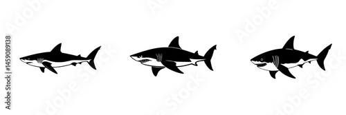 © Антон Сальников, Fototapeta premium Stylized black shark icons showcasing different designs in a flat illustration style