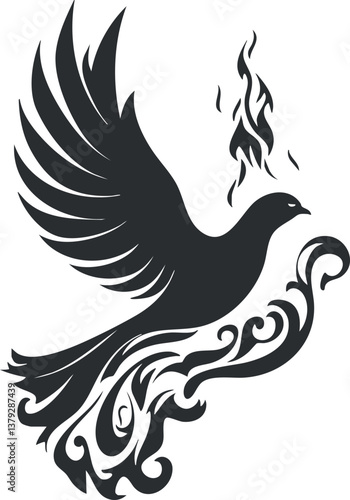 Fototapeta premium Stylized black silhouette of a dove with flames and ornate patterns, symbolizing freedom and peace.