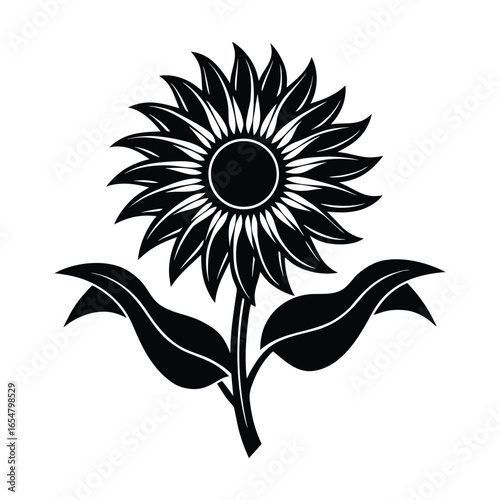 Fototapeta premium Stylized black silhouette of a sunflower with leaves