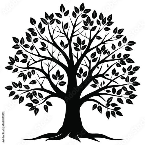 Fototapeta premium Stylized Black Tree Silhouette with Leaves and Branches, Vector Illustration Design