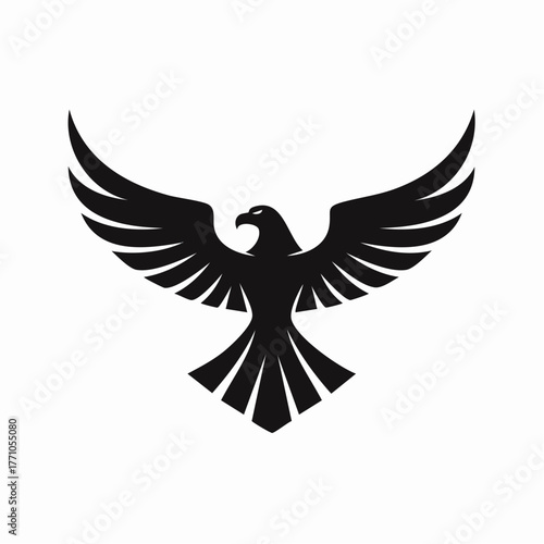 © Budhiana, Obraz premium Stylized black vector silhouette of an eagle with wings folded, sleek clean lines, white background, editable vector for modern minimalist logo design
