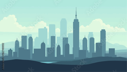 Fototapeta premium Stylized Blue City Skyline with Skyscrapers and Clouds in Modern Digital Illustration