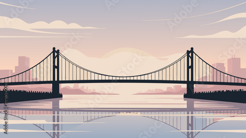 Obraz premium Stylized bridge silhouette over serene water with city skyline reflection and...