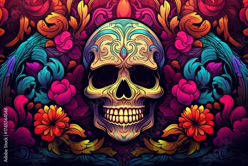 Fototapeta premium Stylized calavera skull, adorned with intricate patterns, takes center stage against a backdrop of vibrant, swirling floral designs