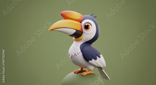 © Gambar, Naklejka premium Stylized cartoon toucan perched peacefully, a whimsical 3D illustration, standing still